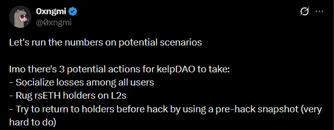 - Variasi ketiga adalah kembali ke kondisi sebelum peretasan melalui snapshot—secara teknis sangat sulit karena adanya pergerakan dana setelah serangan. Peretas telah meminjam $124 juta di Aave Mainnet dan $18 juta di Arbitrum—mungkin jumlah ini yang dapat dikembalikan, sehingga kerugian akhir akan mencapai sekitar $91 juta setelah ditutupi oleh Umbrella.