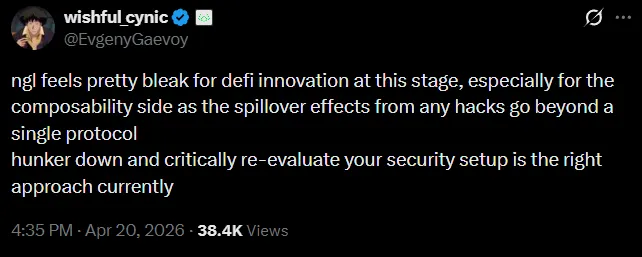Mikhail Yegorov menulis, bahwa jumlah peretasan yang dapat dicegah di DeFi telah mencapai tingkat yang tidak dapat diterima. Akar masalahnya adalah titik-titik kerentanan terpusat: peretasan Kelp memengaruhi LayerZero, kemudian menyebar ke Aave, dan akhirnya pengguna tidak bisa menarik dana, meskipun setiap protokol menyatakan bahwa mereka berfungsi normal.
