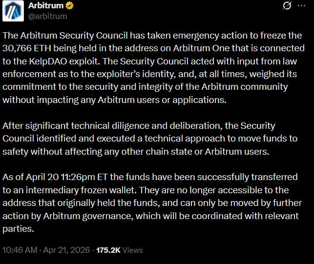 Arbitrum telah mengambil langkah-langkah darurat dan membekukan 30.766 ETH pada alamat yang terkait dengan peretasan Kelp DAO. Dana tersebut telah dipindahkan ke dompet pembekuan sementara dan tidak dapat diakses oleh pemilik asli. Pergerakan dana selanjutnya hanya dimungkinkan melalui pemungutan suara tata kelola Arbitrum.