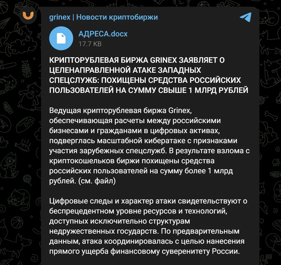 В Grinex заявили, что это была масштабная кибератака с признаками участия «иностранных спецслужб». Хакеры конвертировали все похищенные активы в TRX и вывели токены на один кошелек, где сейчас находится около 45,9m TRX (около $15 млн). Биржа приостановила работу в связи с инцидентом.